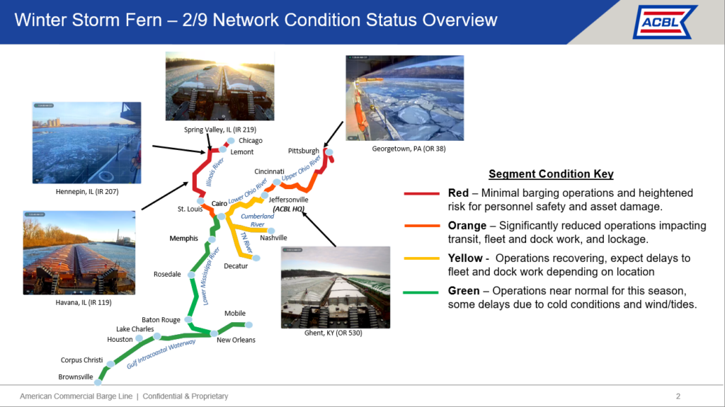 - ACBL has resumed operations on the Illinois River. Vessel movements have recommenced; however, delays should be expected as traffic normalizes, and conditions continue to improve. Northbound and Southbound timings are being planned as conditions allow, but again transits are slower than normal.